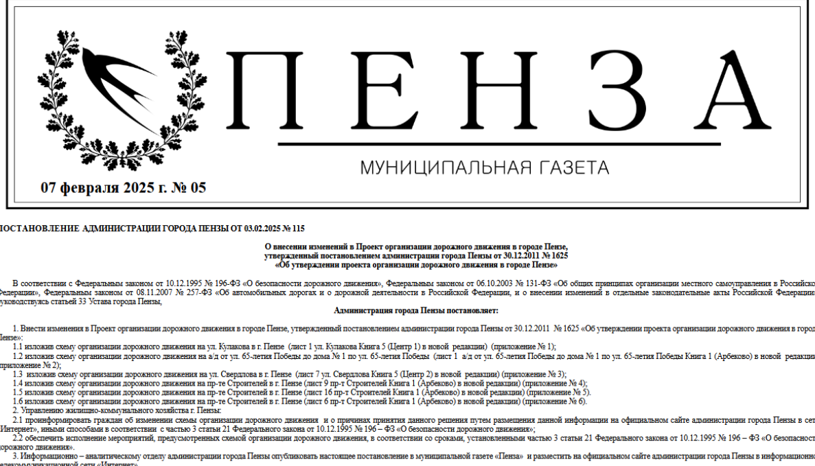 07 февраля вышел выпуск №5 муниципальной газеты "Пенза". Газета учреждена Пензенской городской Думой в соответствии с Уставом города Пензы.