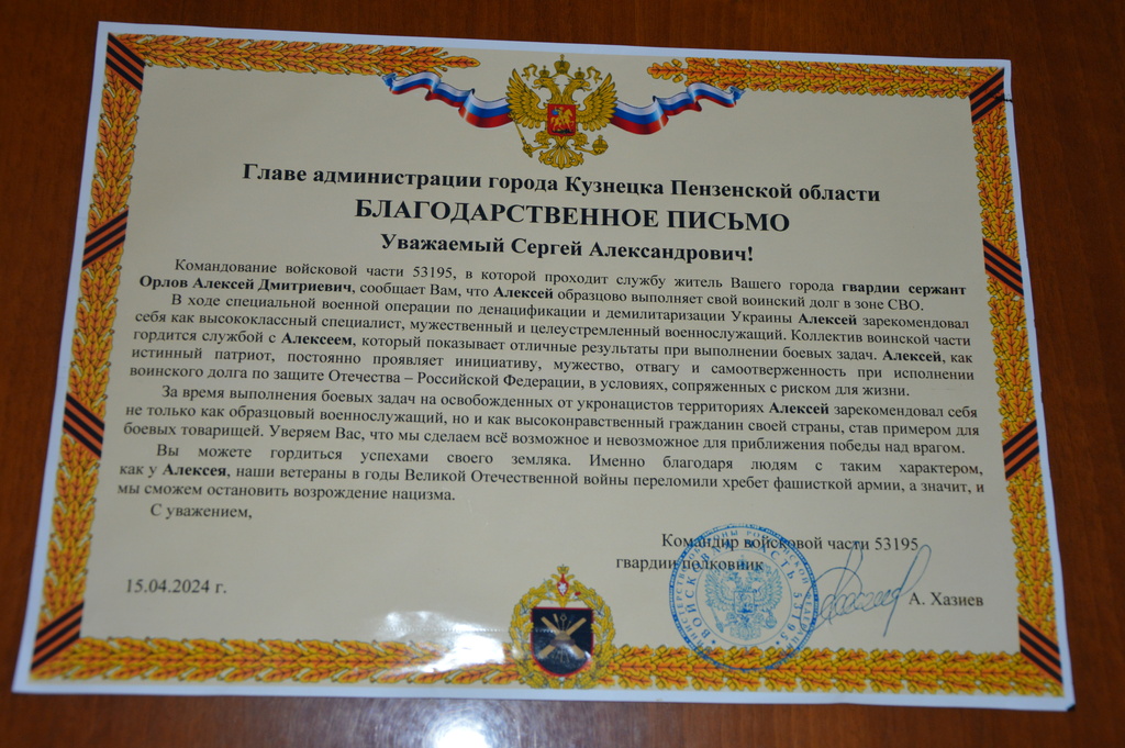 На имя главы города Кузнецка поступило Благодарственное письмо от командования воинской части, где проходит службу наш земляк, гвардии сержант Алексей Орлов. Командование сообщает о том, что Алексей Орлов образцово выполняет свой воинский долг в зоне СВО.