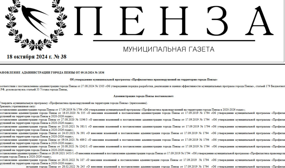 18 октября вышел выпуск №38 муниципальной газеты "Пенза".