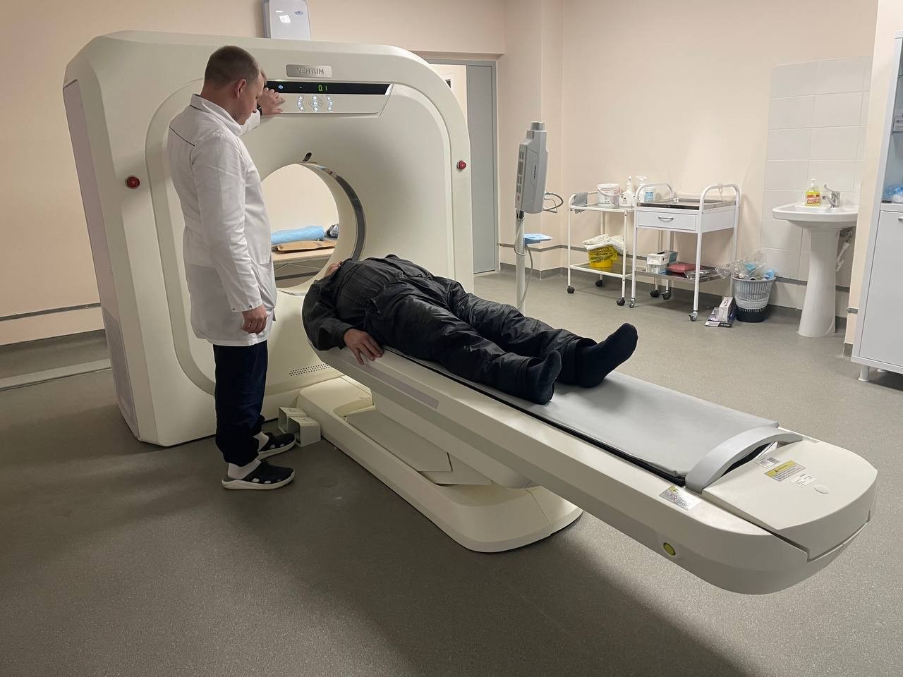 «К установке компьютерного томографа предъявляются высокие технические требования, - отметил главный врач городской поликлиники Владимир Марков. – В первую очередь – к помещению. Поэтому в кабинете КТ проведен капитальный ремонт. Здесь был усилен пол, обновлены вентиляция и электросети, отделка выполнена с применением специального экранизирующего материала, который снижает излучение до безопасных значений».